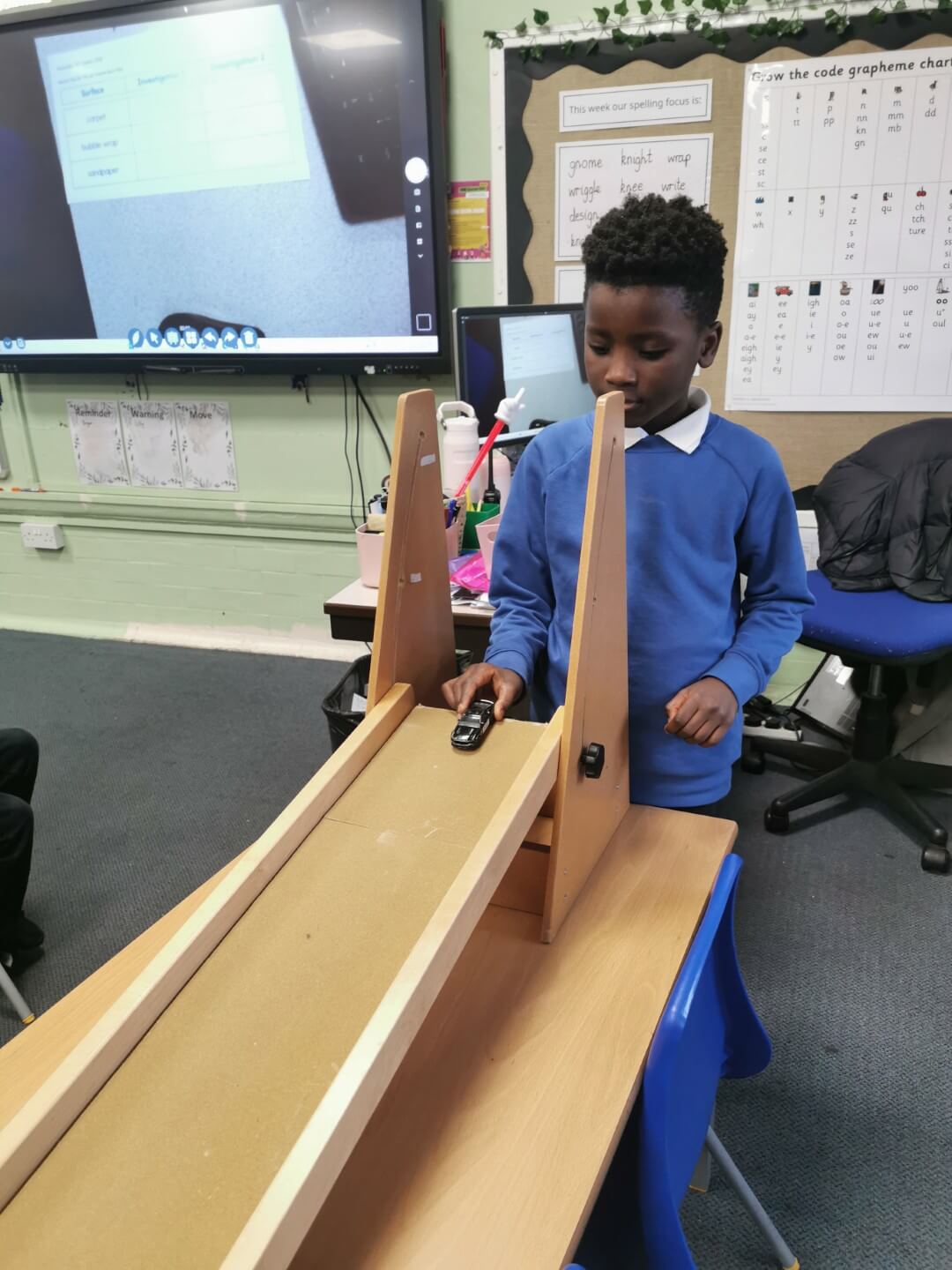 We made sure to change only one variable – the surface the car travelled on. The surfaces tested were carpet, bubble wrap, and sandpaper. From the experiment, the children discovered how friction affects movement. The car travelled the furthest across sandpaper, showing it has less friction, while the bubble wrap almost stopped the car completely, proving it creates the most friction.