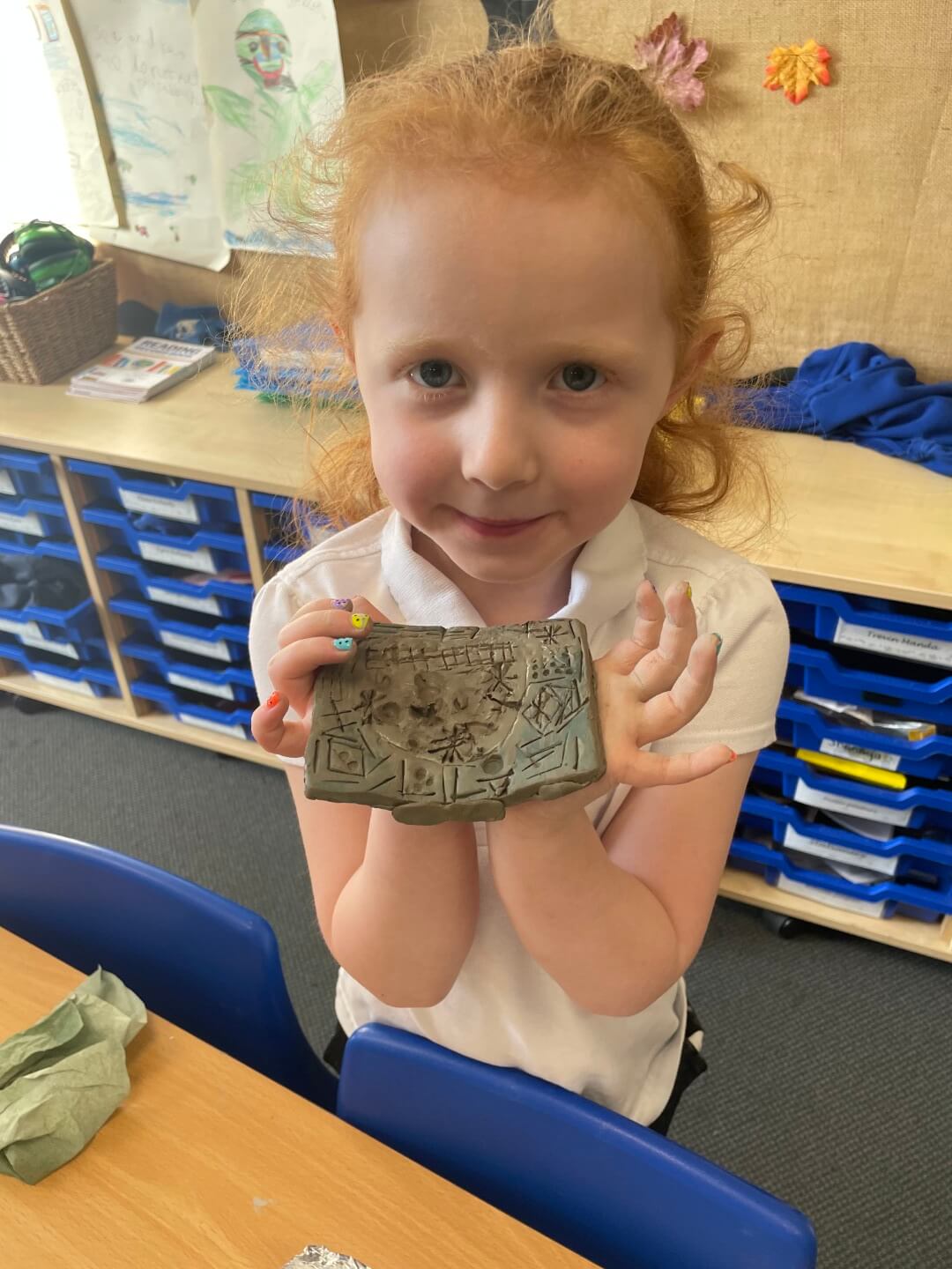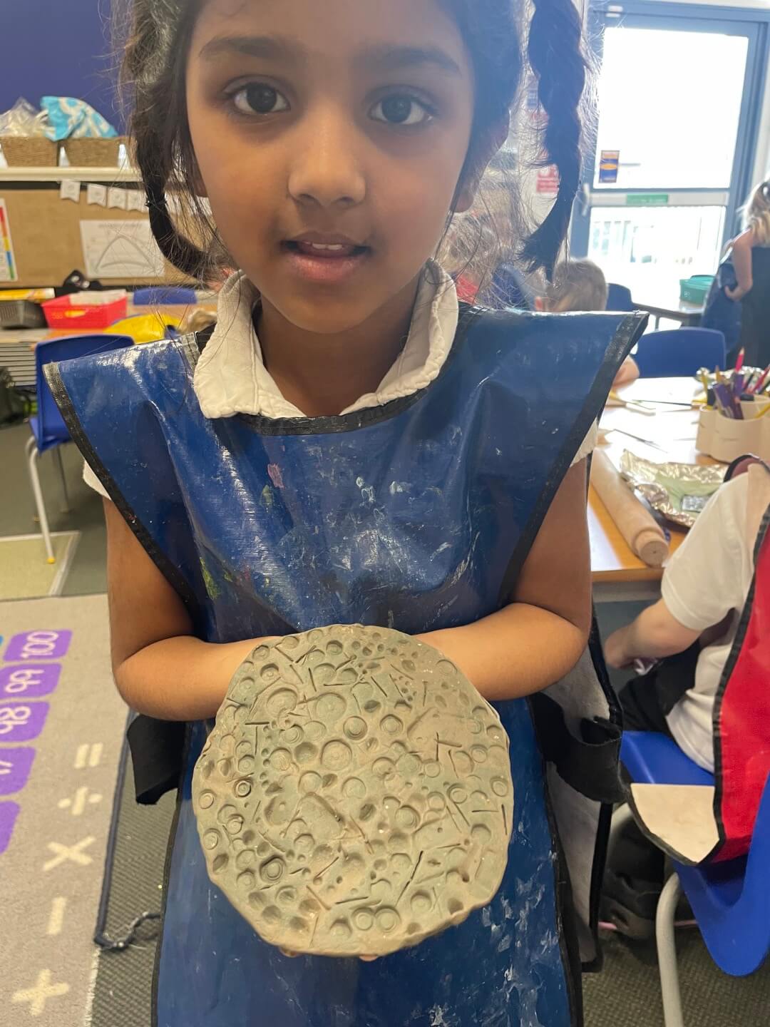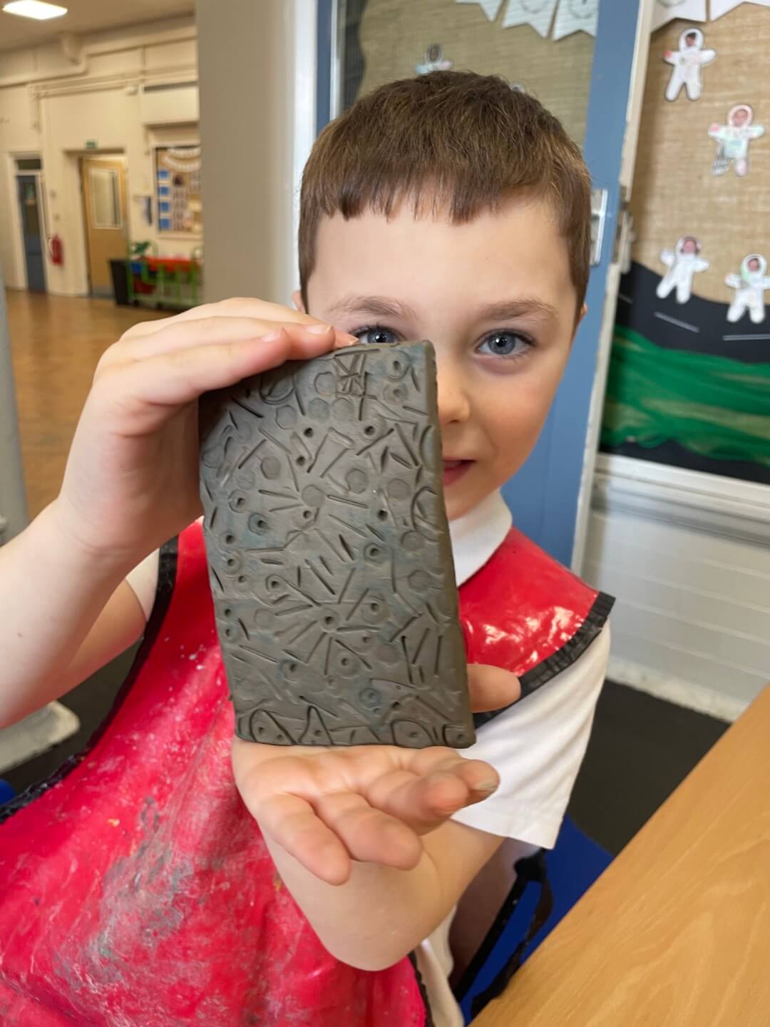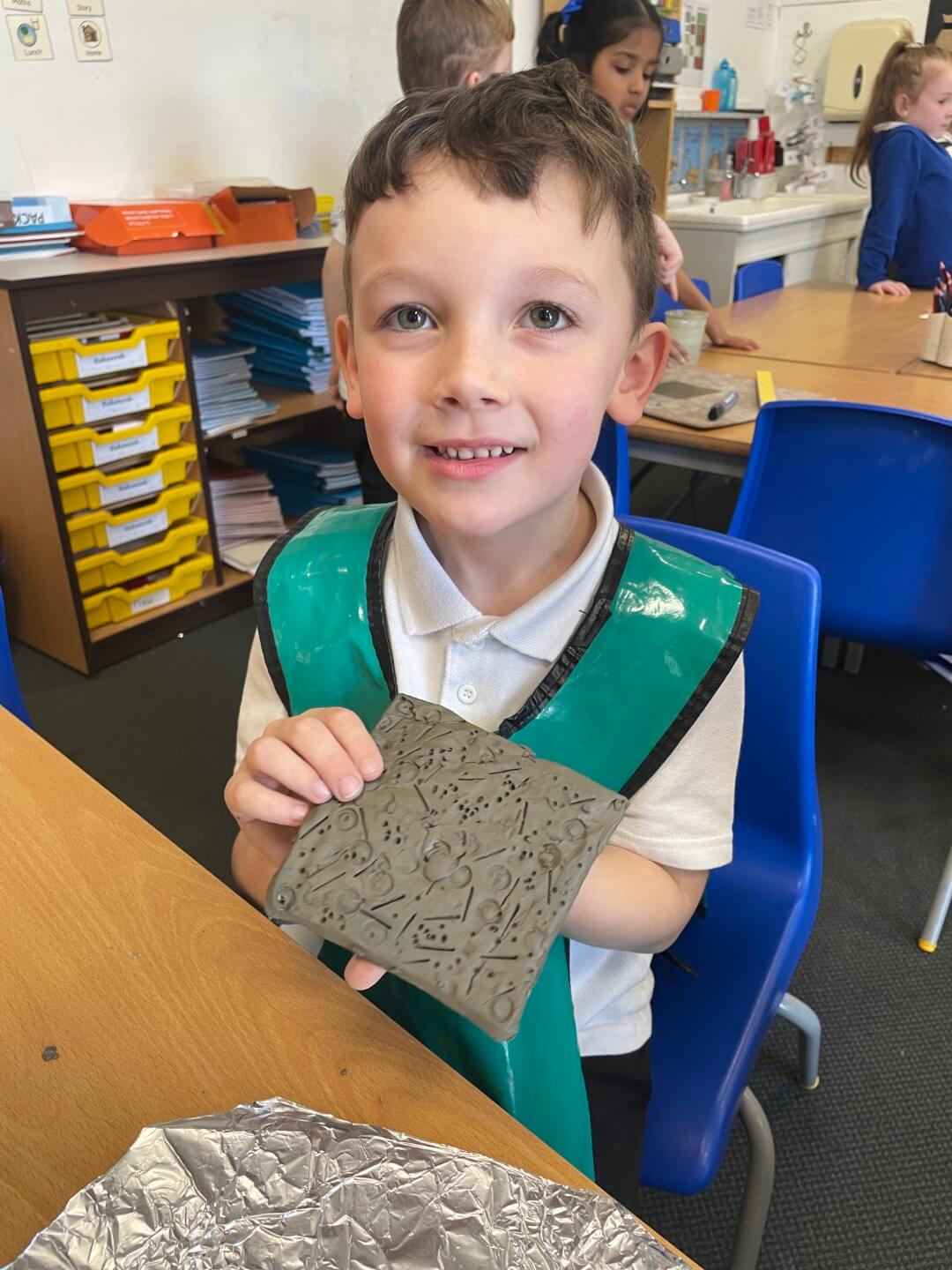 Year 1 have been learning about the work of a ceramicist over the past few weeks. They have developed their skills by learning how to wedge, flatten, and roll clay to create tiles. The children then used a range of tools and objects to make detailed impressions in the clay.