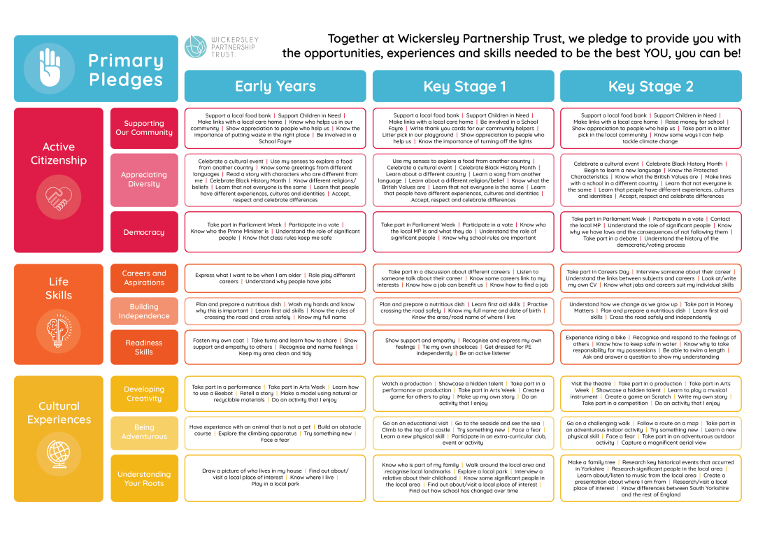 Furthermore, a student who makes that commitment to the Thrybergh Primary Pledges will develop independence and self-discipline by augmenting their participation, performance, communication, creativity and cultural capital.